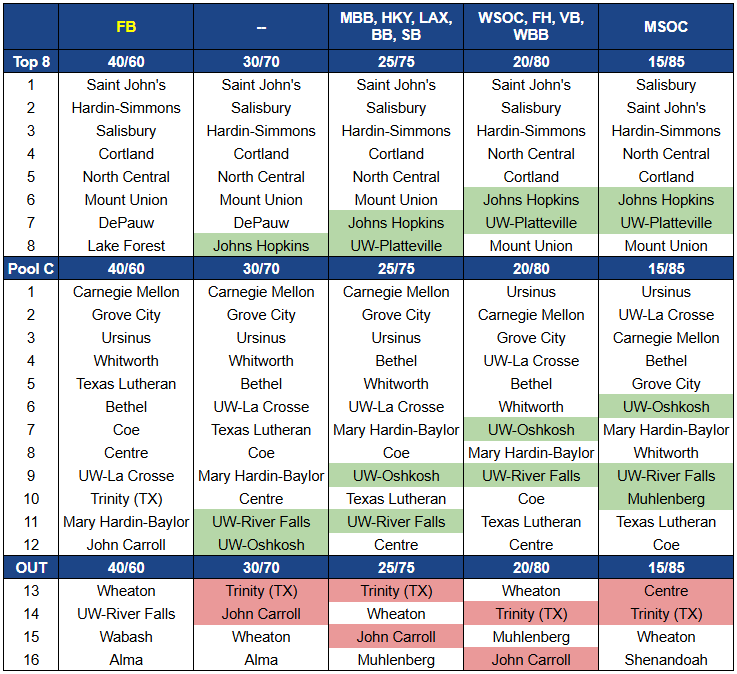 Schools from both the WIAC and Centennial jump out as losers in the current WP/SOS weighting as all four alternates see Johns Hopkins move into the top eight and UW-Oshkosh and UW-River Falls added to the playoff field. The gains for the Centennial are even bigger by going all the way to 15/85 as it would have vaulted Muhlenberg into Pool C position.