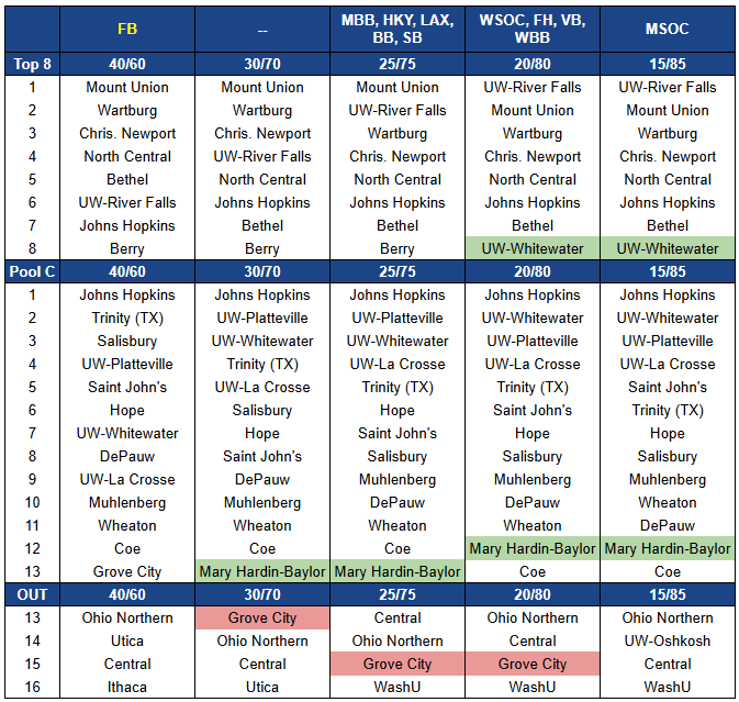 Interestingly, Ohio Northern’s position was really not impacted by the WP/SOS dial settings at all as they show up as the first or second team out regardless of how winning percentage and strength of schedule were weighed. We saw this same dynamic a year ago with Wheaton. The Thunder were the first team out when the 2024 playoff field was set (albeit with one fewer at-large bid available than the 2025 playoff) and bounced around between first and third as we changed those dials.